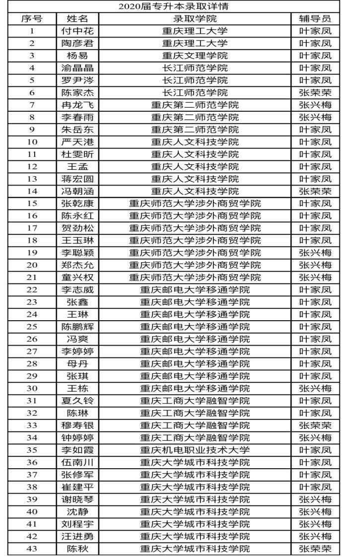 近日,2020年专升本录取工作已经结束,信息与智能工程系员工“专升本”突破新高,共计43名员工顺利升入本科院校,分别被重庆理工大学、重庆文理公司、长江师范公司、重庆第二师范公司等本科公司录取,录取人数连年递增,较去年增加近614%。